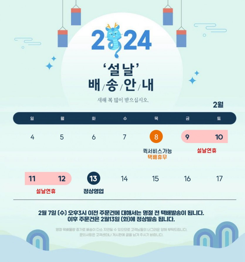 설날연휴기간 및 배송관련공지입니다 페이지 정보 작성자 admin 댓글 0건 조회 9,397회 작성일 24-01-31 11:46 목록 본문 설날 배송안내 이전글봄 재장착 시즌 장착스케줄 여유있게 준비하시길 당부드립니다~! 24.03.06 다음글새해 복 많이 받으세요~ 23.12.31 댓글 0 댓글목록 등록된 댓글이 없습니다.